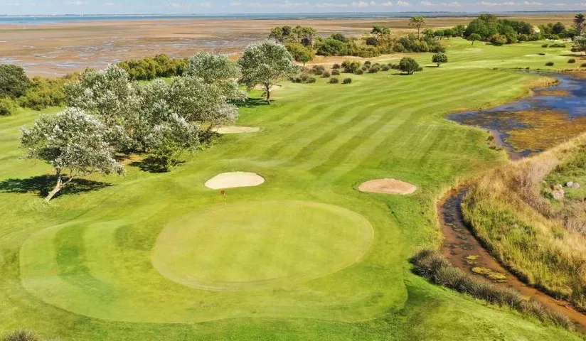 Situé sur la commune de Saint-Pierre d’Oléron, à portée de regard du Fort-Boyard, le golf d’Oléron fait face aux îles de l’Atlantique. Dans un cadre exceptionnel, le long de l’Océan et des dunes de la côte Est, le Golf d’Oléron, homologué de neuf trous est un véritable écrin de verdure et de calme. Il s’agit d’ailleurs d’un des très rares golfs en France où le bord de mer fait partie du terrain de jeu. Le golf d’Oléron fait face à l’océan sur environ 2 km, entre Boyardville et le chenal d’Arceau. Créé en 1987 par l’architecte Olivier Brisson, le Golf d’Oléron parcours de type links, c’est-à-dire entièrement intégré à l’environnement, est un golf 100% naturel. Aucun travail de terrassement n’a ainsi été effectué pour la réalisation de cet équipement. Les parcours comprennent de nombreux obstacles d’eau et de la végétation dunaire. Ils régaleront aussi bien les amateurs occasionnels que les joueurs plus aguerris : ceux-ci découvriront un terrain assez technique, de par sa configuration étroite avec un slope de 140 (départ des blancs) pour les hommes et de 144 pour les femmes. Ouvert toute l’année, le golf d’Oléron s’étend sur environ 30 hectares. Au-delà de son parcours homologué de 9 trous, le Golf d’Oléron compte également deux putting greens, un parcours école 6 trous et un practice de 25 places. Des cours individuels et collectifs vous sont aussi proposés. Ils sont encadrés par un professeur diplômé d’Etat. Des stages y sont également organisés. L’association du Golf d’Oléron organise des compétitions régulières individuelles et par équipe, gère l’école de golf et fait vivre le club tout au long de l’année. Différentes formules, avec des tarifs attractifs, sont possibles : initiation à la journée, abonnements à l’année, tarifs junior… . . .